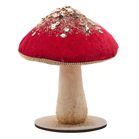 Jouluinen ja näyttävä samettinen sieni joulukoriste, tuo yleellisen ripauksen jouluun. Iso kokoinen koriste on upea lisä koriste keräilyihin. Kultaisilla yksityiskohdilla koristeltu upea joulun punainen sävy on kaunis yhdistelmä.
