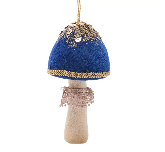 Lumoava ja näyttävä samettinen sieni joulukuusen koriste, tuo yleellisen ripauksen joulukuuseen. Iso kokoinen koriste on upea lisä koriste keräilijöille. Kultaisilla yksityiskohdilla koristeltu upea sininen sävy on kaunis yhdistelmä.