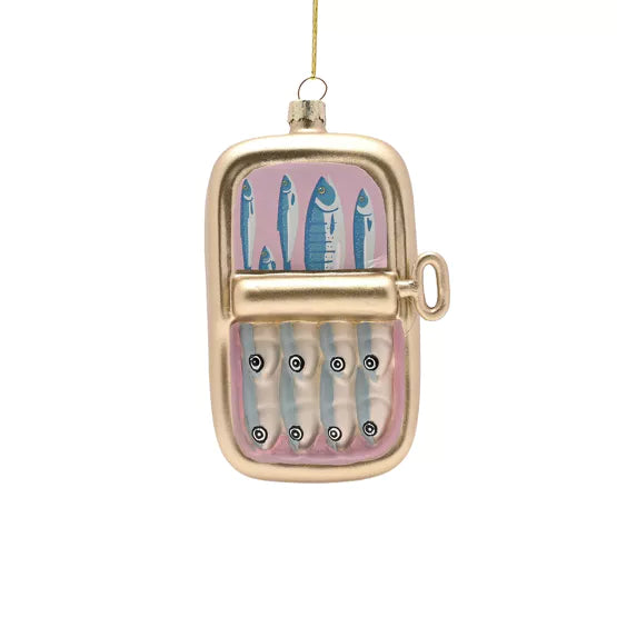 Trendikäs Sardiini -purkki joulukuusenkoriste, jonka sisällä on sardiineja vaaleanpunaisessa nesteessä. Tässä näyttävä koriste, joka voisi olla tänä vuonna sinun uusi jouluvalikoiman jäsen? Upea koriste, yhdistele vaaleanpunaisten ja muiden herkullisten koristeiden kanssa, takuulla koristeessa huomataan.