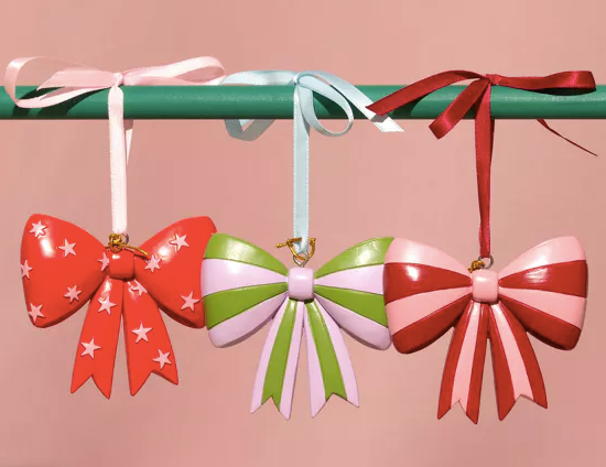 Suloiset ja ihanan raikkaan väriset rusetti joulukuusenkoristeet. Valmistettu kestävästä hartsista, pastellin väriset ripustusnauhat tuovat ihanaa väriä jouluun.