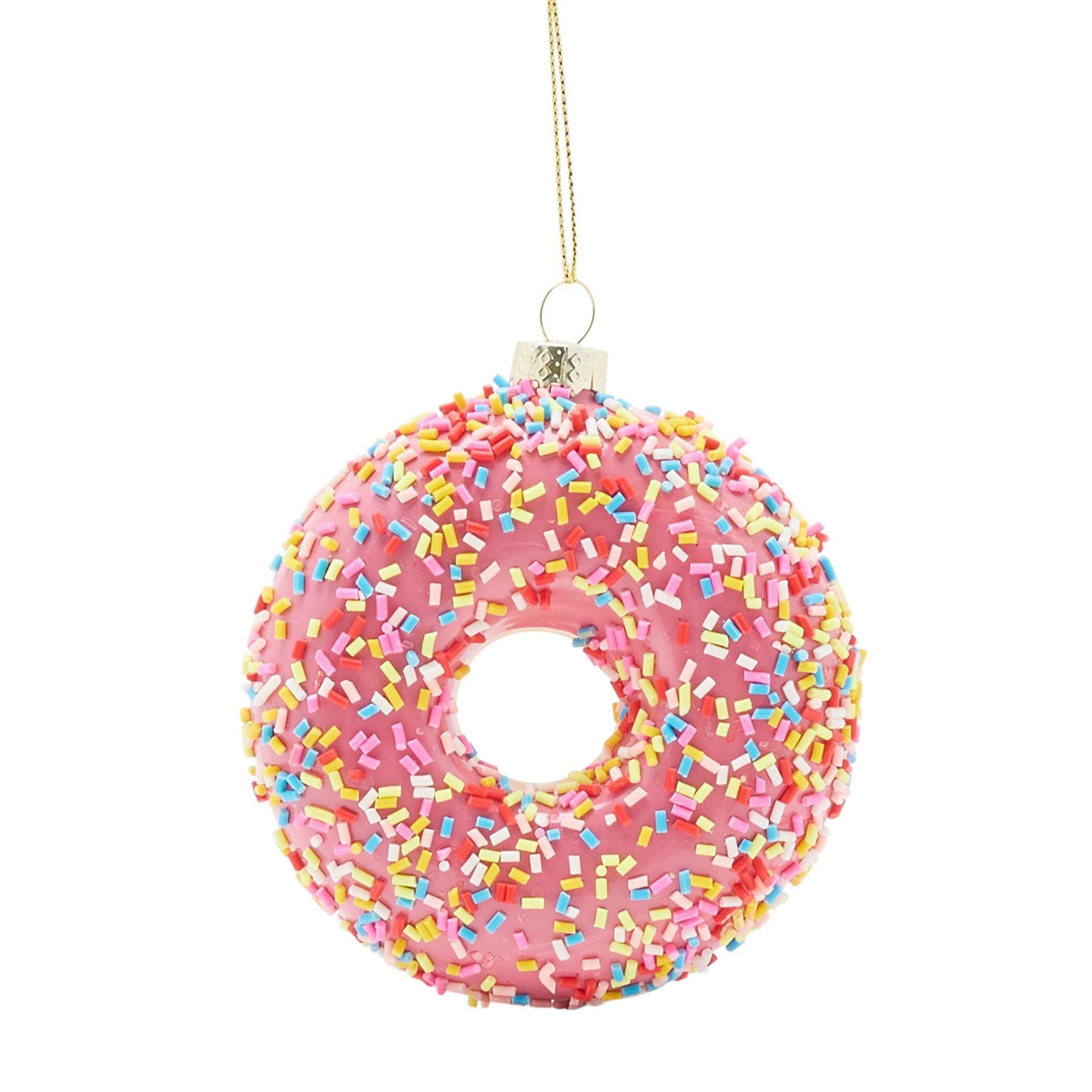 Pinkillä kuorutteella ja strösseleillä koristeltu donitsi, syötävän herkullisen näköinen, mutta älä maista tätä, vaan koristele kuusesi tänä vuonna tällä suloisella koristeella.