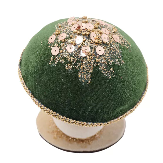 Jouluinen ja näyttävä samettinen sieni koriste, tuo yleellisen ripauksen jouluun. Iso kokoinen koriste on upea lisä koriste keräilyihin. Kultaisilla yksityiskohdilla koristeltu upea joulun vihreä sävy on kaunis yhdistelmä.