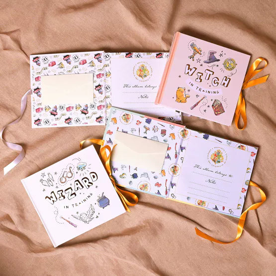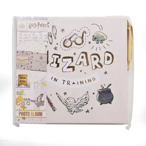 Harry Potter valokuva-albumi Tämä mystinen valokuva-albumi sopii täydellisesti nuorten noitien valokuvien esittelyyn. Albumi on pehmeän sävyinen ja upean näköinen, ja siinä on Harry Potter teemaisia kuvia. Kannessa on kultainen "Wizard in Training" tai "Witch in Training" -teksti. Albumin täydentävät personoitu etusivu, sisäkannen kirjekuori ja albumin sulkeva nauha.